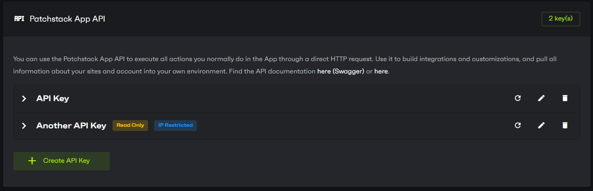 Section titled “How to get Patchstack App API key?”To get the API key, log in to your Patchstack account, go to account settings and navigate to the Integrations page. On this page, you are able to generate multiple App API keys for your account with the optional ability to: