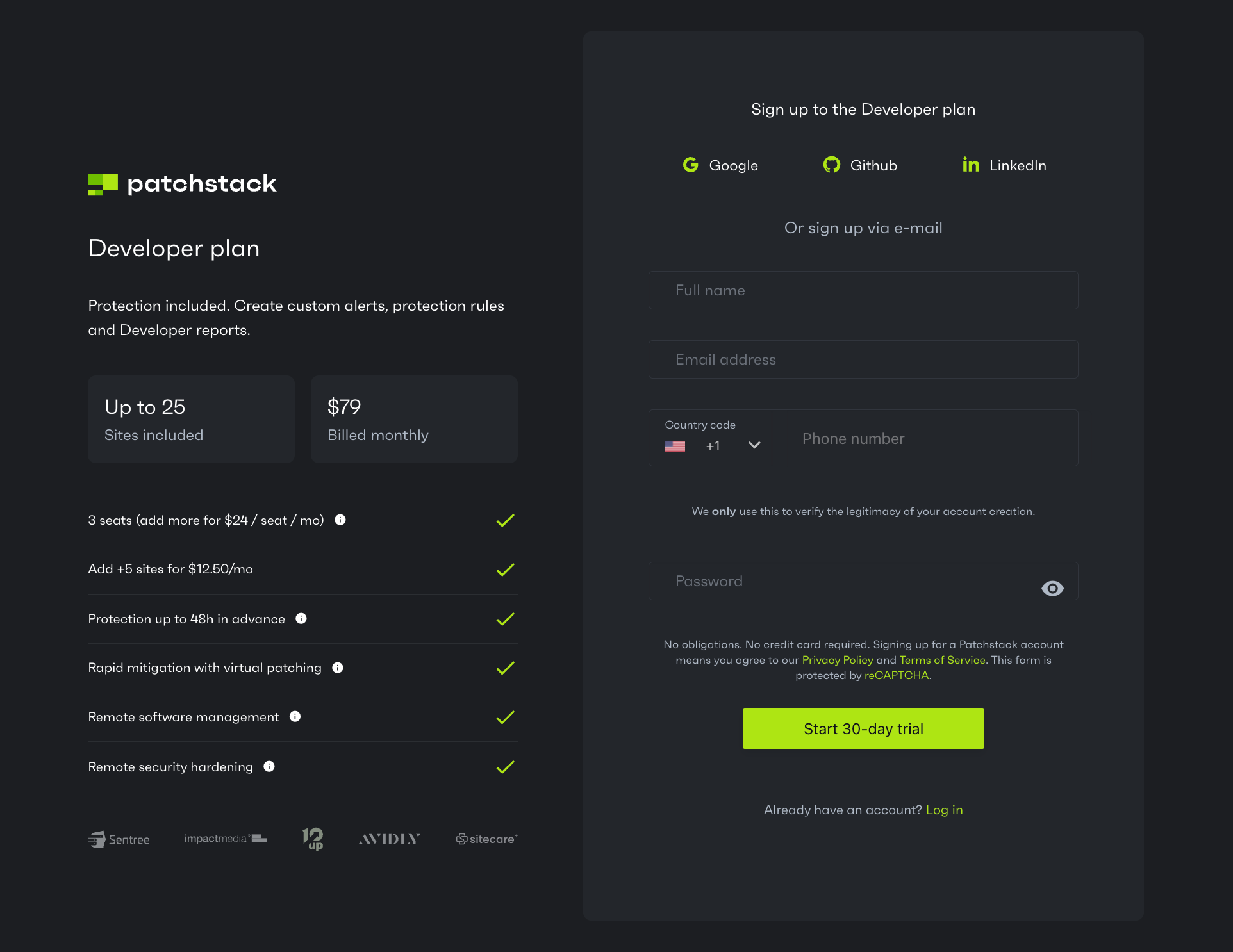 Section titled “Step #1 — Register your account”Sign up for Patchstack App to manage and protect your WordPress sites.