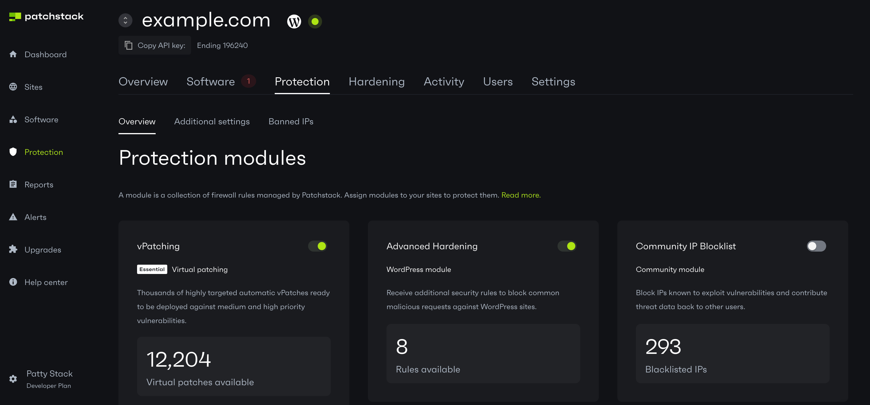 Navigate to the general protection overview page by visiting Protection from the navigation menu, or click here: https://app.patchstack.com/protection/overview