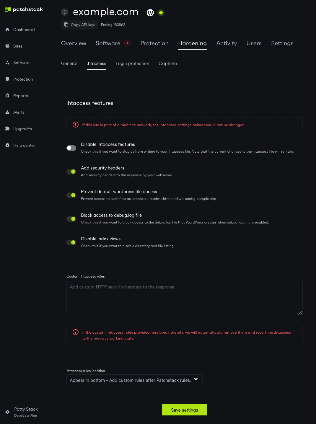 Hardening rules are extra firewall settings, that can be tweaked according to your needs. To manage your site’s .htaccess settings, navigate to Sites > yourdomain.com > Hardening > .htaccess in Patchstack App.
