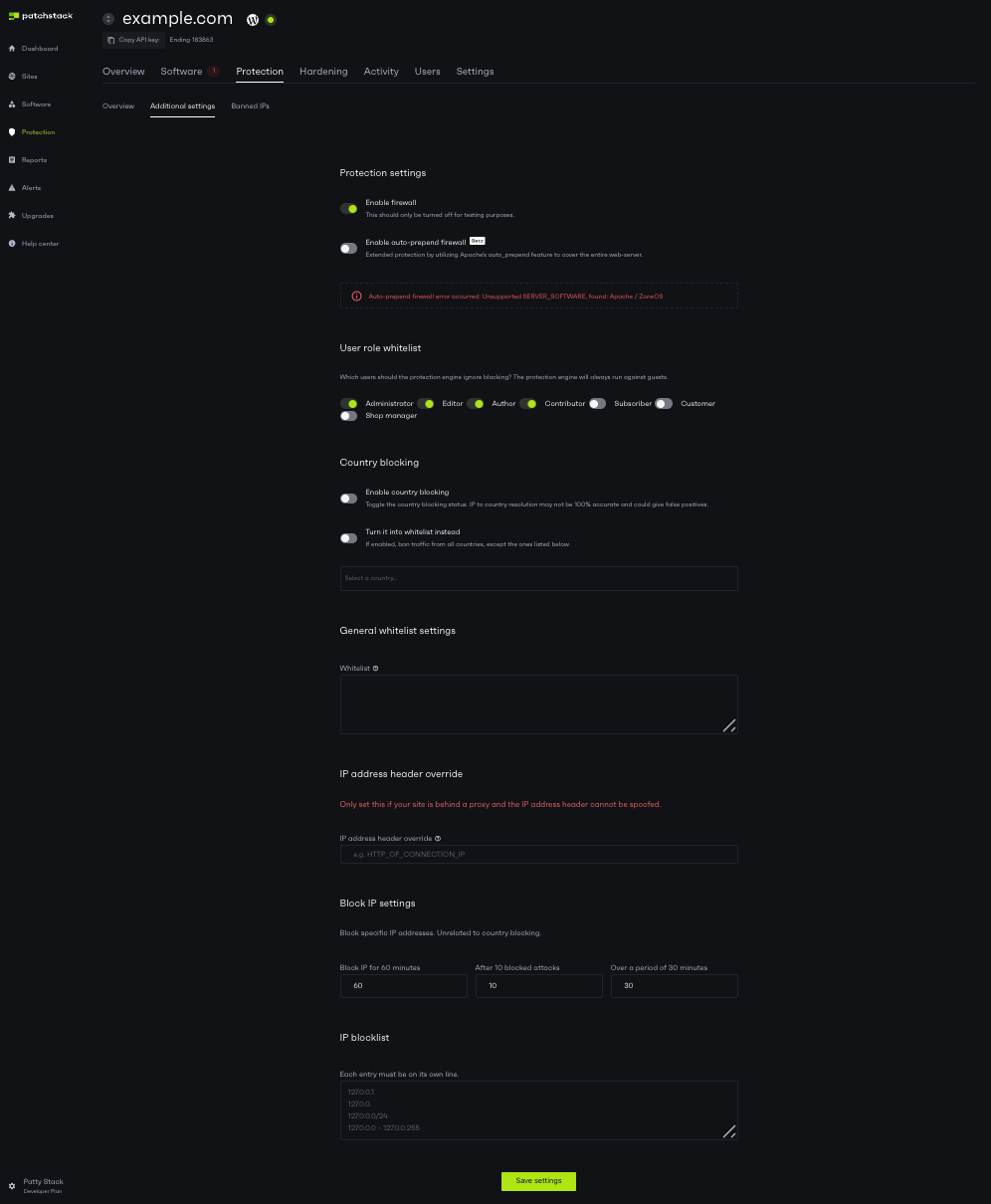 Section titled “Protection settings”Enable firewall - this toggle enables or disables Patchstack’s firewall. When turned off, your site won’t be protected by virtual patches or firewall rules. However, other security measures (such as IP bans and .htaccess rules) will remain active. We recommend disabling the firewall only for testing purposes.