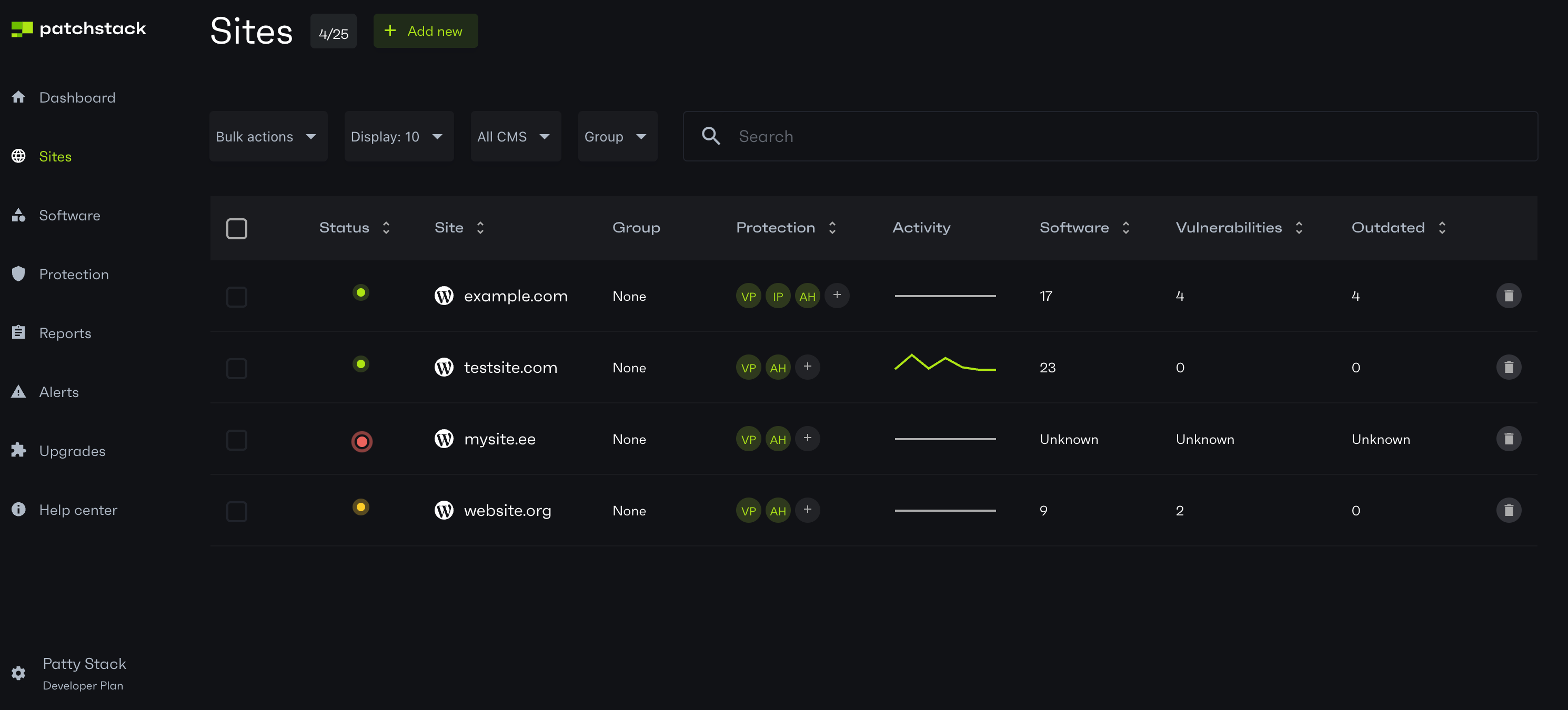 On the Sites page you see a general overview of all the sites you have added to the Patchstack App.