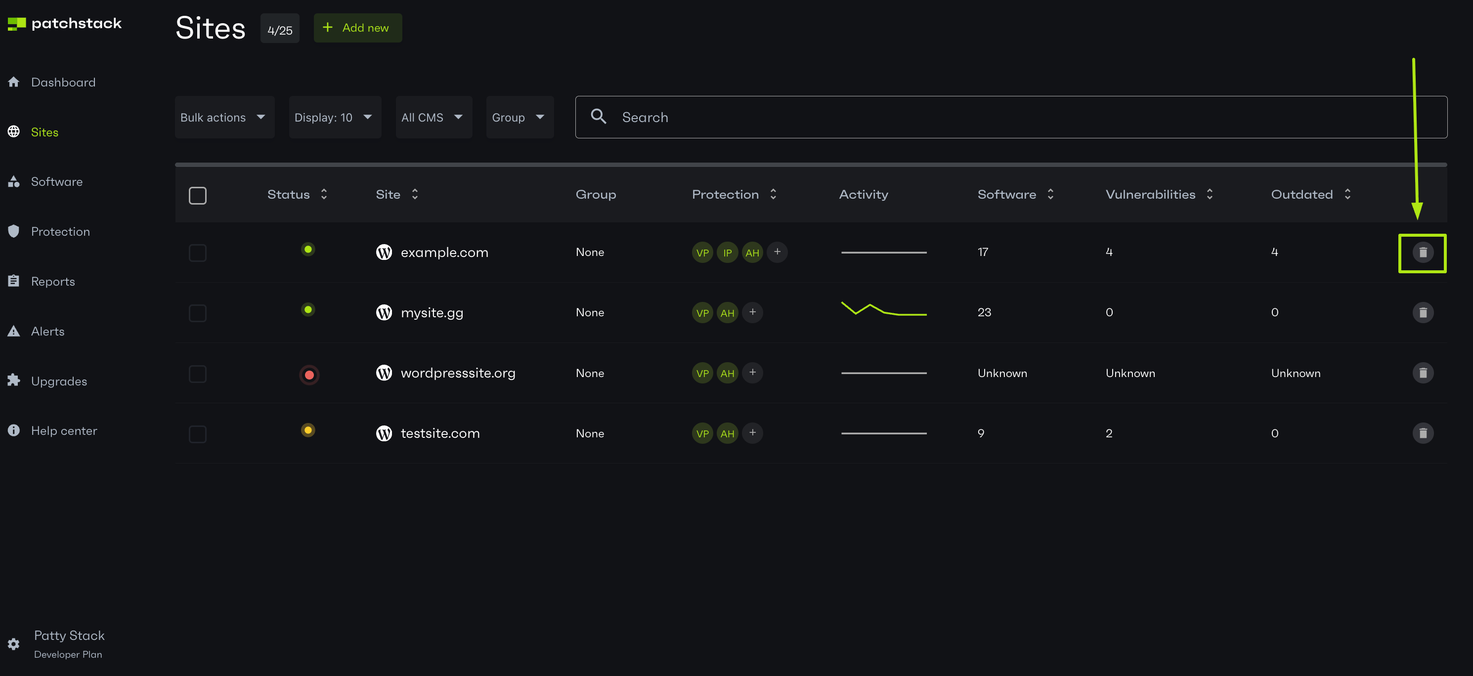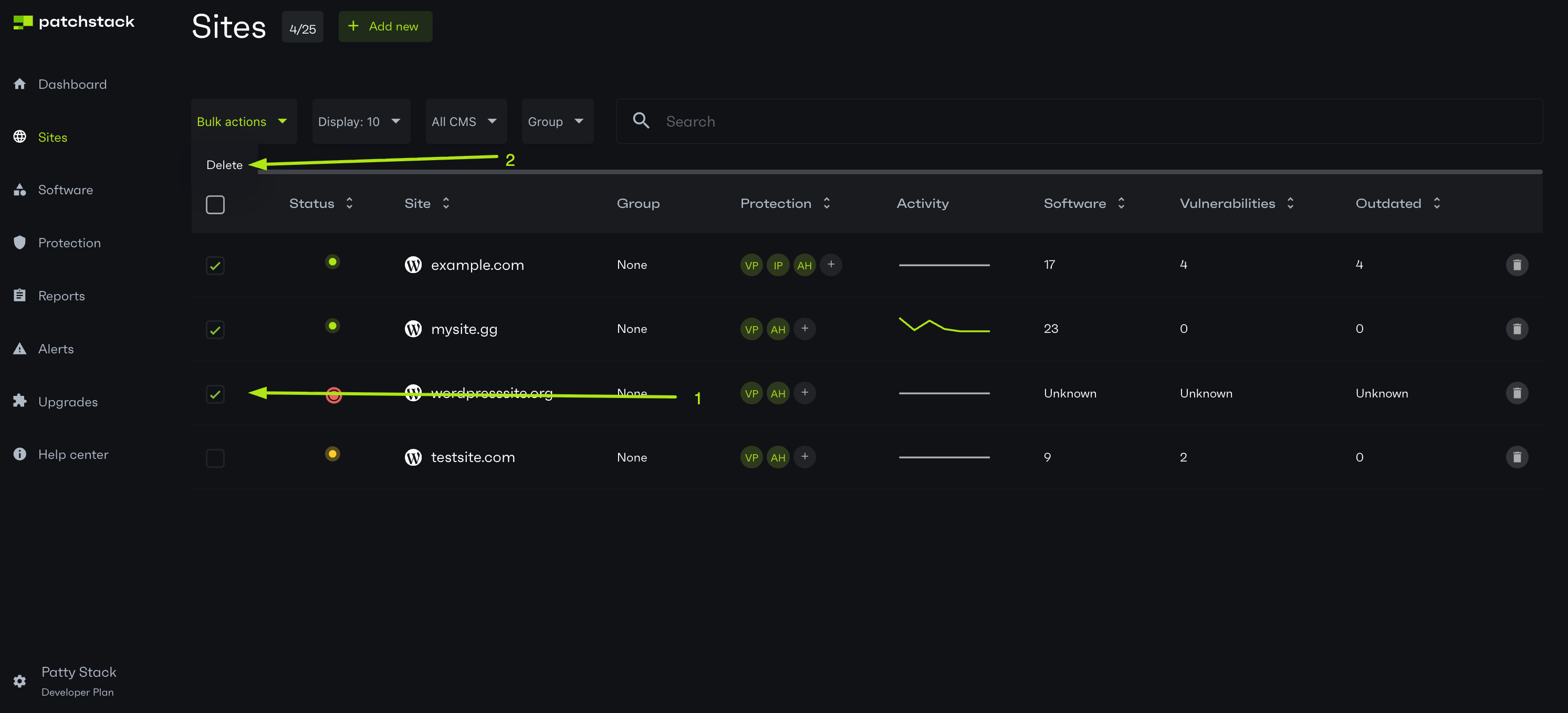 Section titled “Removing sites in bulk”To bulk delete your sites from Patchstack App: